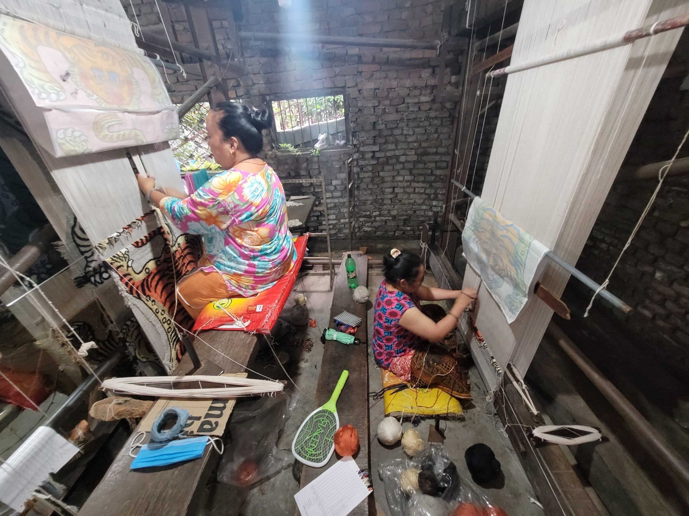 ネパールの職人さんが原材料から糸を紡ぎ出し、伝統的な織り機で丁寧に手織りし、1枚1枚を裁断し洗いをして1枚がやっと完成します。